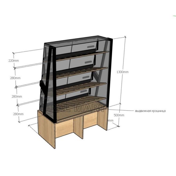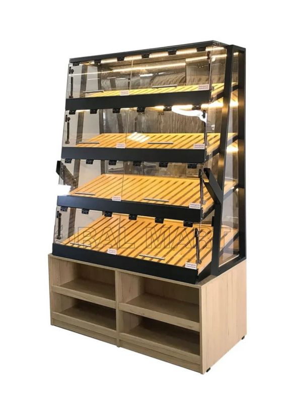 - Освещение светодиодная лента (свет – тёплый белый) на каждой полке
