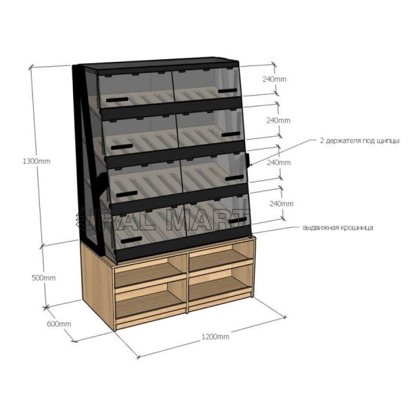 - 8 передних дверок из оргстекла на газовых амортизаторах, фиксирующихся в верхнем положении (автоматическое дооткрывание);