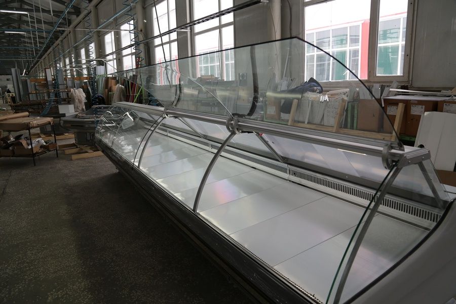 Отличие холодильных витрин серии "Титаниум Lux" от "Титаниум": подъем фронтального стекла на гидролифтах.