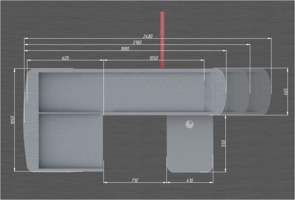 - ЛДСП толщиной 16 и 25 мм, боковые кромки из ПВХ (столешница, навесные полки, разделитель в накопителе, укрепление рабочей поверхности). Ламинат серого цвета сочетается с цветом бампера.