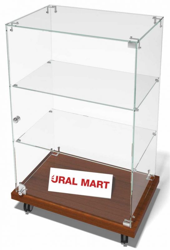 Основание изготовлено из ламинированной ДСП толщиной 26 мм с кромкой из ПВХ толщиной 2 мм. Полки, боковины, задняя стенка изготовлены из стекла М1 6 мм (дверки – 5 мм). Имеются колесные опоры с фиксаторами. В комплект витрины при необходимости могут быть включены регулируемые опоры и полки 8 мм.