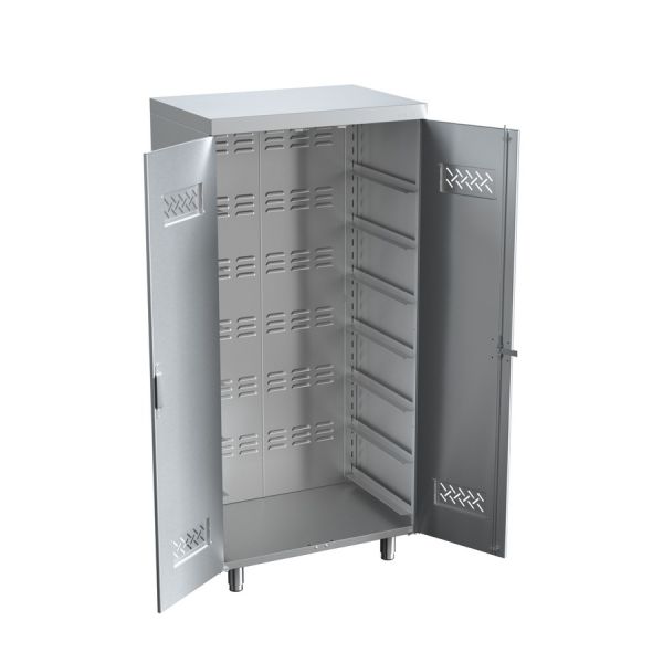 Шкаф закрытый для хлеба ШЗХЛ с распашными дверками, с замком и перфорацией. Материал: оцинкованная сталь (дно и задняя стенка), нержавеющая сталь AISI 430 0,8 мм (остальные элементы). Дополнительно вы можете приобрести деревянные лотки 740х450 мм для хлеба ЛХ-740.450-02 (стоимость 3440 р.).