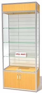 Профиль окрашенный (по выбору из каталога RAL) или анодированный. Материал заполнения – ламинированная ДСП, цвет по выбору. Дверки стеклянные, распашные. Задняя стенка витрины – экономпанель.