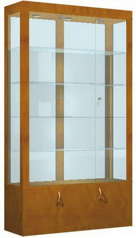 Стеклянные дверки витрины и дверка в тарнике оснащены замком. Высота накопителя составляет 500 мм. В комплект входят четыре полки из стекла толщиной 6 мм и подсветка. Материал - ламинированная ДСП 16 мм. Толщина кромки из ПВХ - 2 мм, дверки и боковины - 4 мм. Варианты расцветок: белая, пепельная, яблоко локарно, клен, вишня оксфорд, бук, венге. Витрина может быть изготовлена по вашему размеру.